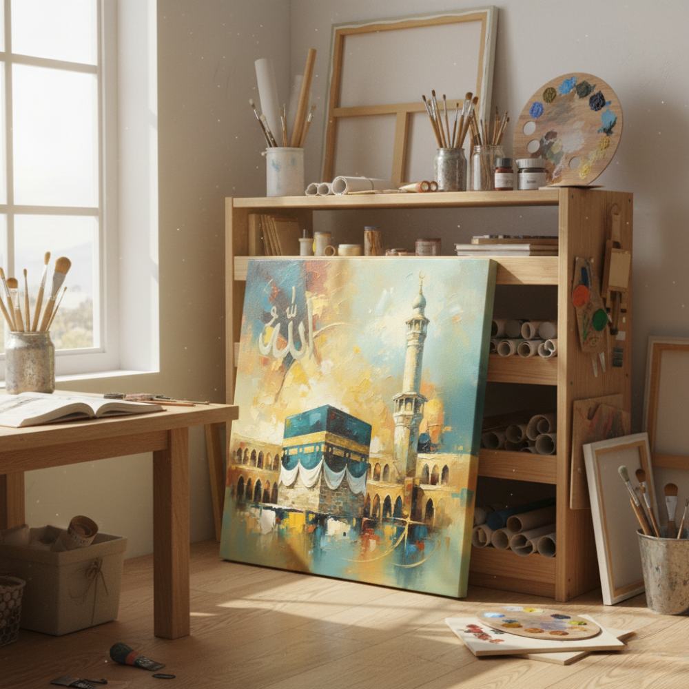 This artwork invites the viewer into a moment of profound spiritual reflection, centering on a revered site of pilgrimage and prayer. The composition is filled with a dynamic sense of light, suggesting either the brilliant warmth of sunrise or the evocative glow of sunset. The building and its surrounding structures stand solid and majestic, yet the atmosphere around them feels fluid and dreamlike, emphasizing the emotional power of the location. Warm tones of gold and amber dominate the upper portion, transitioning into deep blues and teals in the reflections below, creating a striking contrast that draws the eye across the entire scene. Subtle symbolic elements are woven into the sky, reinforcing the painting’s theme of devotion and peace, making it a compelling piece for any space.